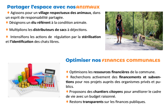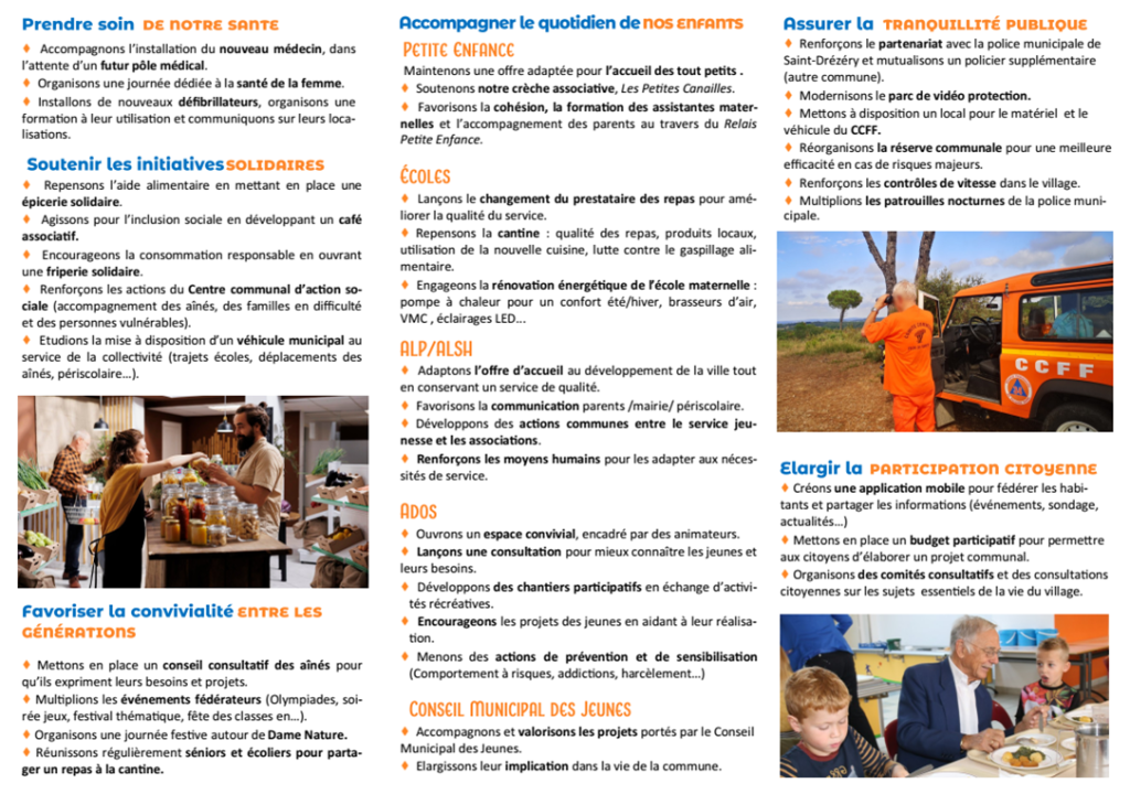 cadre de vie, circulation, aménagement raisonné, économie, éducation, jeunesse, solidarité, environnement, culture, animations, finances…